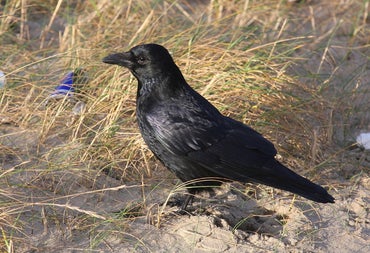 Geheel zwart verenkleed met vlakke kop en krachtige snavel.
