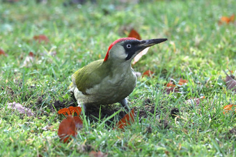 Appelgroen van boven met gele snuit. Rode kruin, zwart gezicht met donkere mondstreep, bij mannetje met rood centrum bij vrouwtje zwart.
